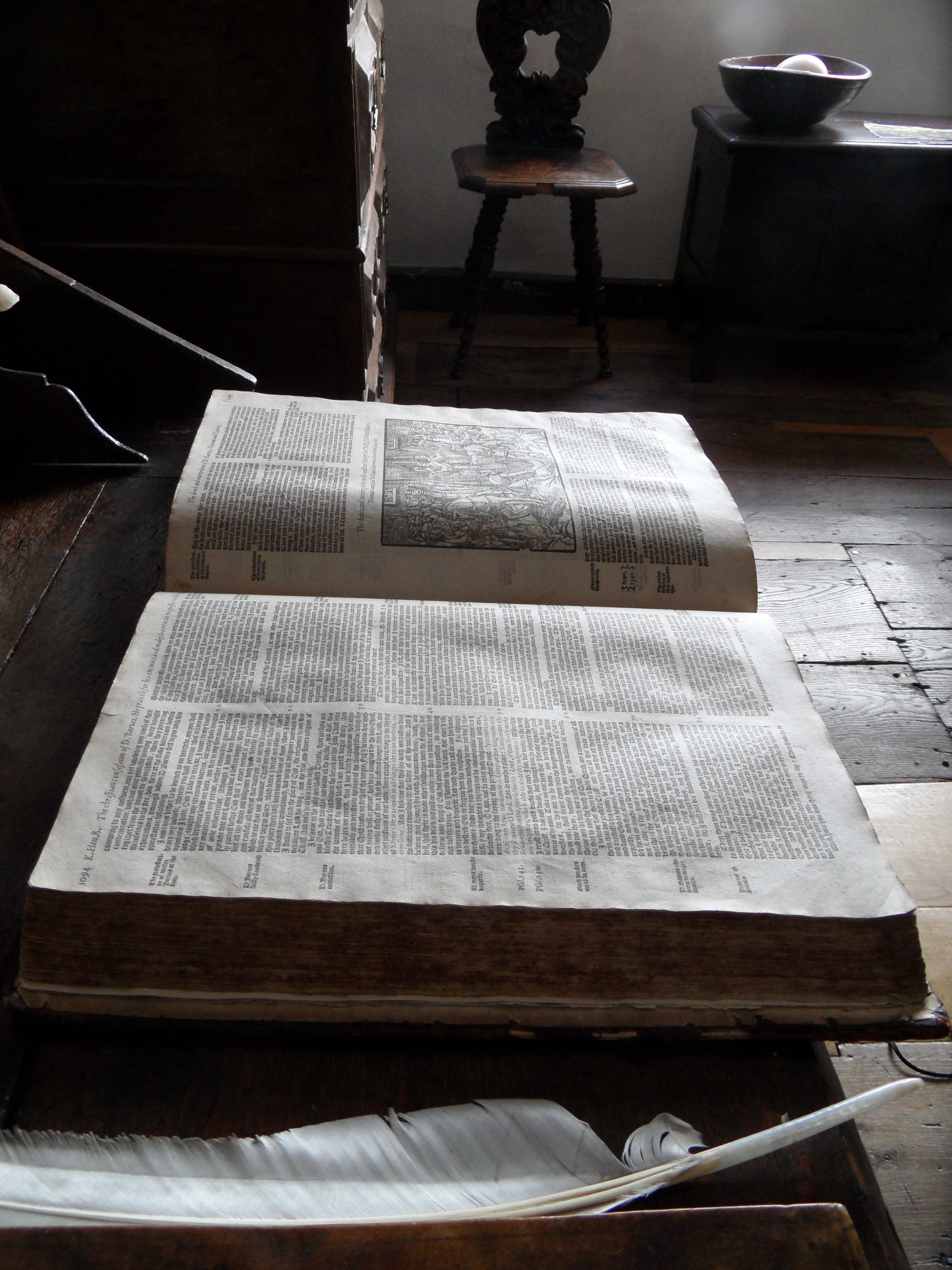The tour continued upstairs to a small room which the curators suspect to have been a study. Beyond the very faint remains of what seems to have been a crest painted above the fireplace, the room itself is fairly unremarkable. On a desk inside it, though, lay what I found to be the most exciting exhibit of the entire tour: an original copy of Foxe’s Book of Martyrs, loaned to the House on the condition that it remain open to be read and touched rather than stuffed behind glass. I could picture the joy my A-Level history teacher would have taken in seeing this, one of the great early masterpieces of propaganda detailing the suffering of Protestant heroes at the hands of wicked Catholics. Even ignoring the content, the physical book itself was incredible: the invention of the printing press stands chronologically between the development of written language and the advent of the internet as one of humanity’s great leaps forward in information sharing, and here was something that rolled off one of those first primitive presses, laid out for visitors to touch and turn its pages.