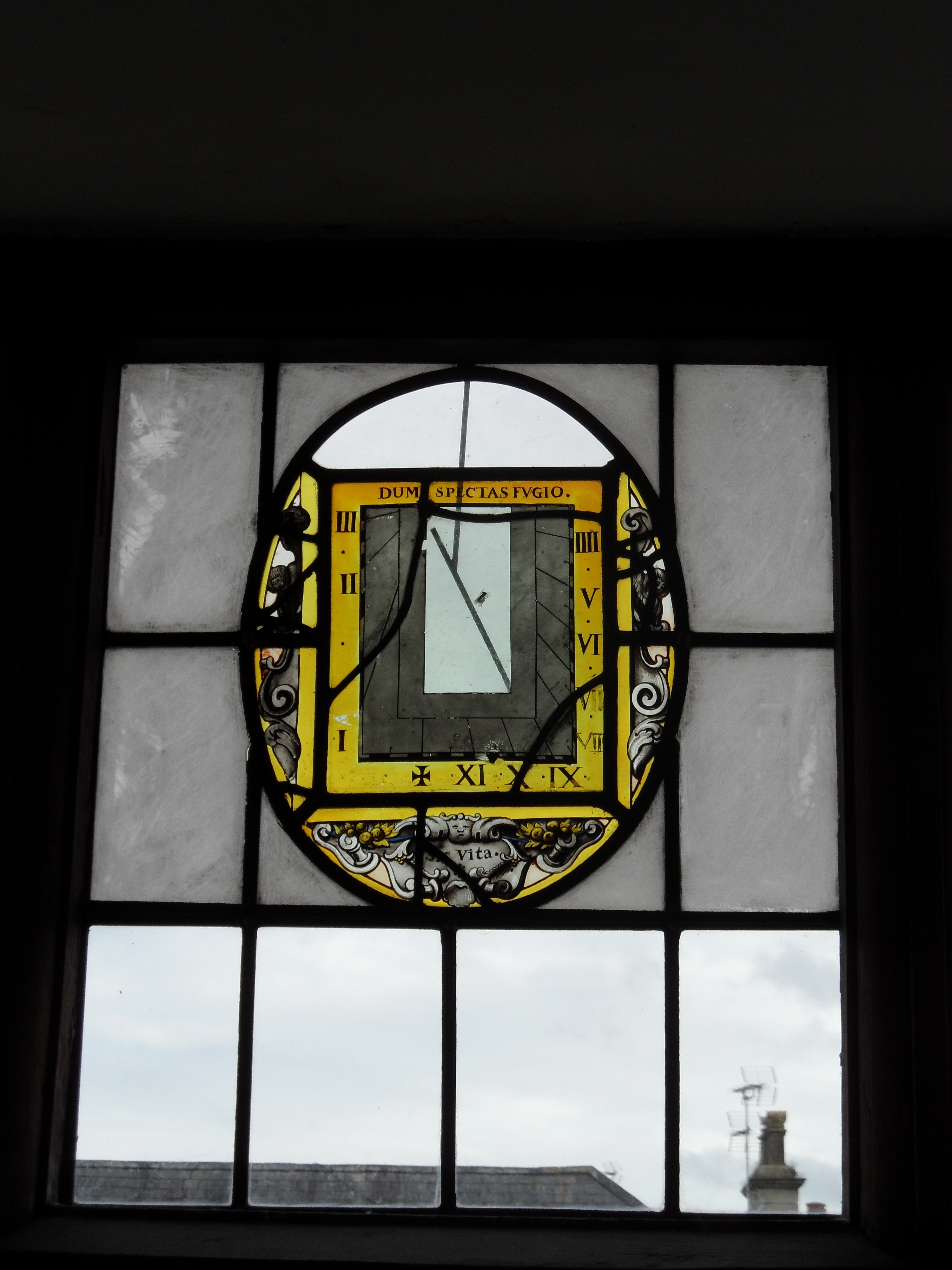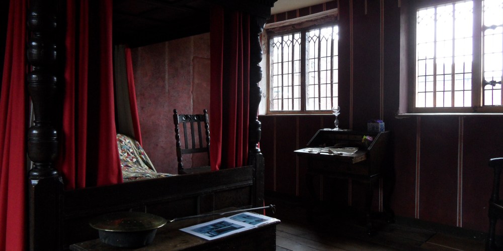Inside the chamber, as with all the rooms, are a number of artifacts from around the time it was built, although of all these only a solitary earthenware wine jug in the kitchen actually belonged to the house. In one corner sits a chest into which somebody has rather charmingly etched the abridged version of their life story, complete with a spelling mistake that has seen them carve a line through the errant letter and write the correct one above. In the window sits an original stained glass panel of a sundial with the Latin quip, ‘Dum spectas fugio’- ‘While you look, I fly’; a rather poignant comment about fleetingness of time- painted onto it. The addition of a painted housefly rounds off this seventeenth century japery.